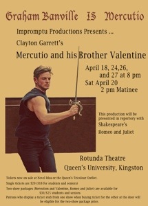 Mercutio and his Brother Valentine will continue next week at the Rotunda Theatre, Queen’s University, Kingston at 8 pm on April 24, 26 and 27. Romeo and Juliet will be at 8 pm on April 25 and 2 pm on April 27. I will try to make my entrances on time.