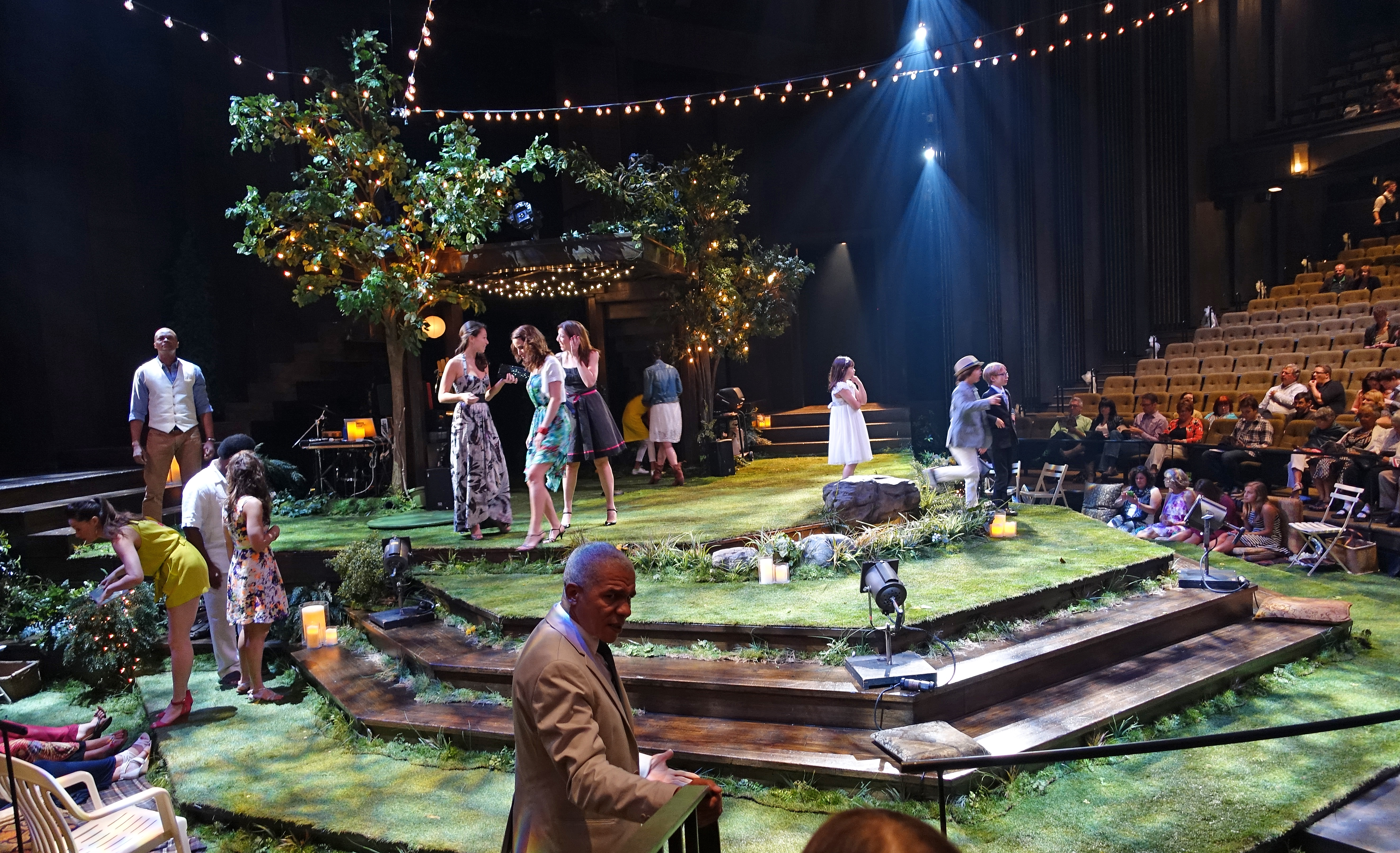 The bare thrust stage at the Festival Theatre converted to a summer garden party for Midsummer Night's Dream.  As the audience came in, actors as partygoers, mingled and chatted with them.