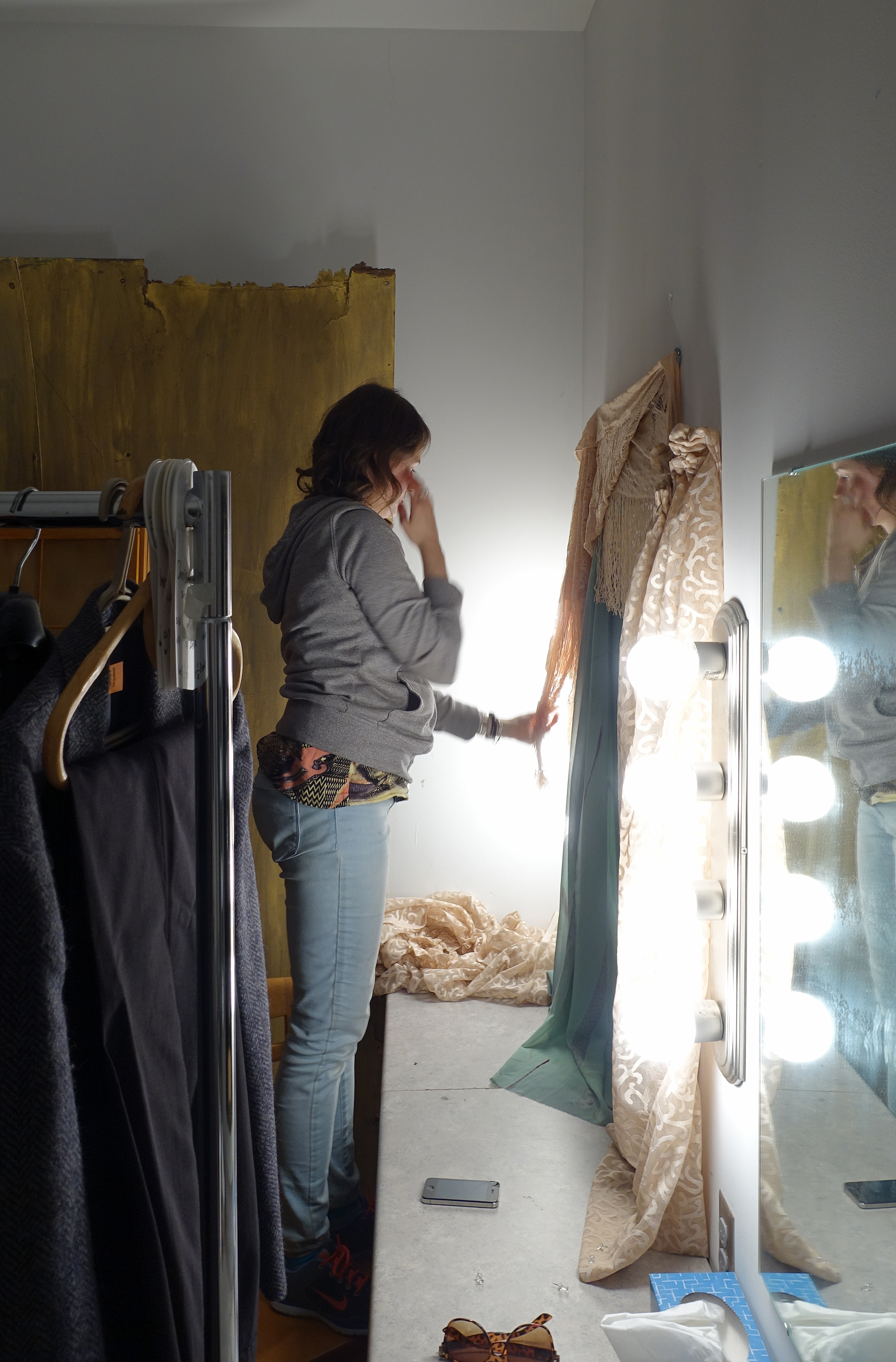 Now, if you are going to look to dress a set, the best place to be is in a theatre.  Soon the small crew came up with pieces of wall and drapes and lights and set pieces that turned one corner of the DominoTheatre dressing room into a wonderfully warm set, rich with great character.