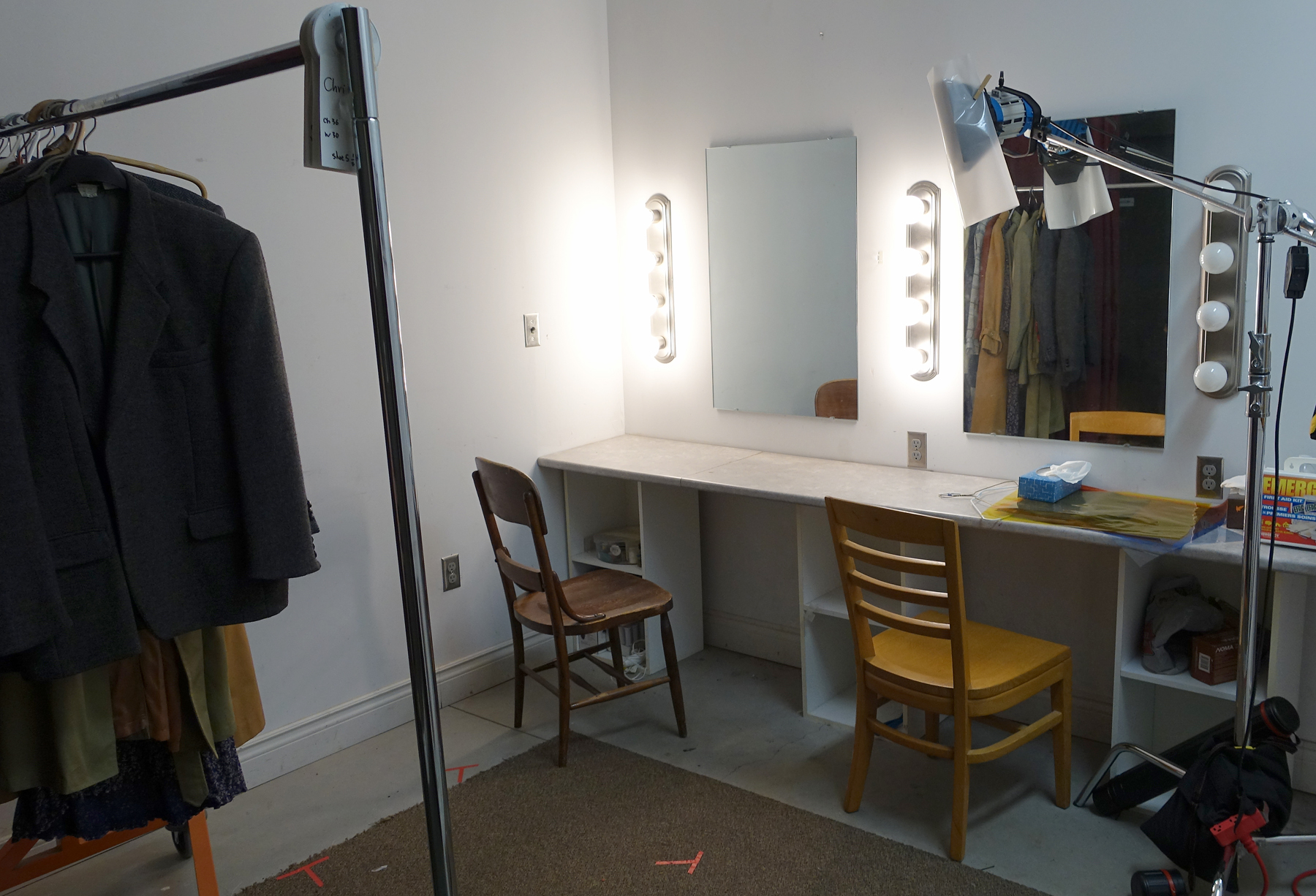 DR1Last weekend the crew of Fault were challenged with turning that little room into a location for their movie, presumably a dressing room in the rural “Barn Theatre” where some of the movie action occurs.  Last year, scenes on the stage of the “Barn” theatre, in the lobby and lounge and outside the theatre were filmed. An additional pick up scene was required to finish the film and the original location was not available.  Fault‘s producer, Barbara Bell, coaxed her Kingston theatre friends to let Fault use the Domino dressing room for this scene.