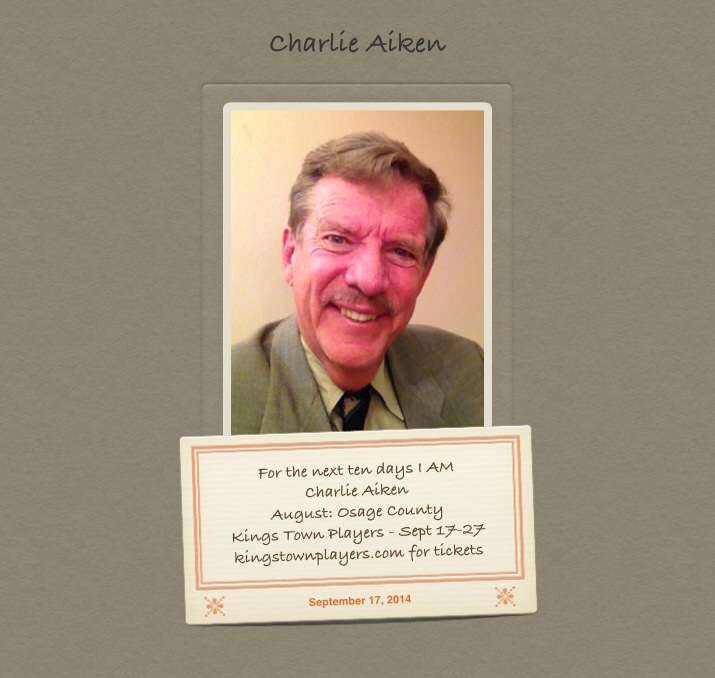 Well sixty years later I am still doing this.  Starting tonight, my Kings Town Players friends and I are dressing up and playing with each other and putting on a show for you.   I am having great fun playing the role of Charlie Aiken. Over the past few weeks,  I have gradually transfoimagermed myself into the dope-smoking, beer-swigging upholsterer from the southern U. S. A. who is caught up in one of the most dysfunctional families you can imagine.