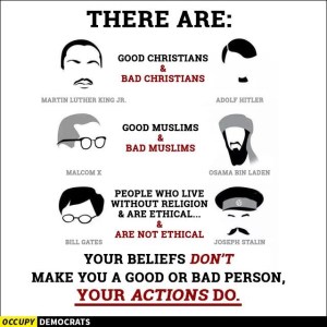 There are good people and people whose actions can be classified as evil.  This has nothing to do with where they come from or what god they pray to, if any.