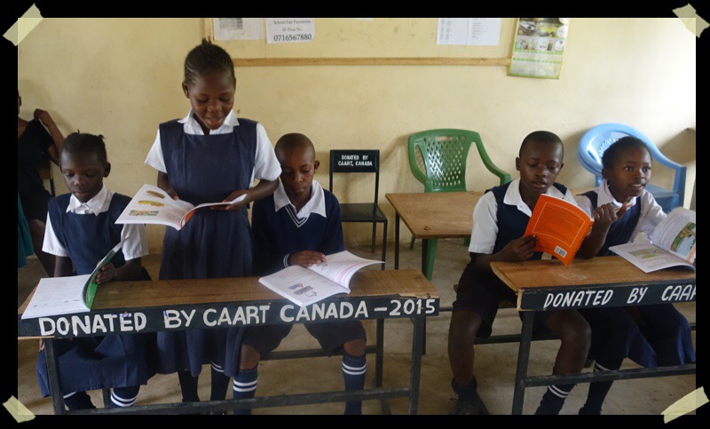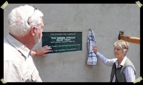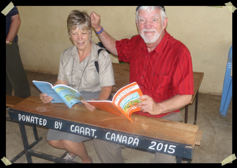 CanAssist trustees, Judith and John , relive scool days at one of the desks recently built by CanAssist for Hope School.