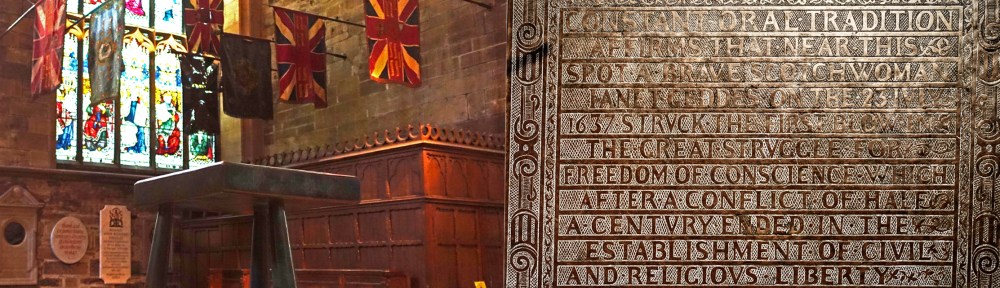 Book_of_common_prayer_Scotland_1637I revisited the place where Jenny Geddes (not my niece, the other one) threw a stool (a wooden one, not the other kind) at the Pastor who was attempting to read from the Common Book of Prayer that was being introduced (forcefully) on the Scottish Church by Charles I at St Giles in July, 1637.