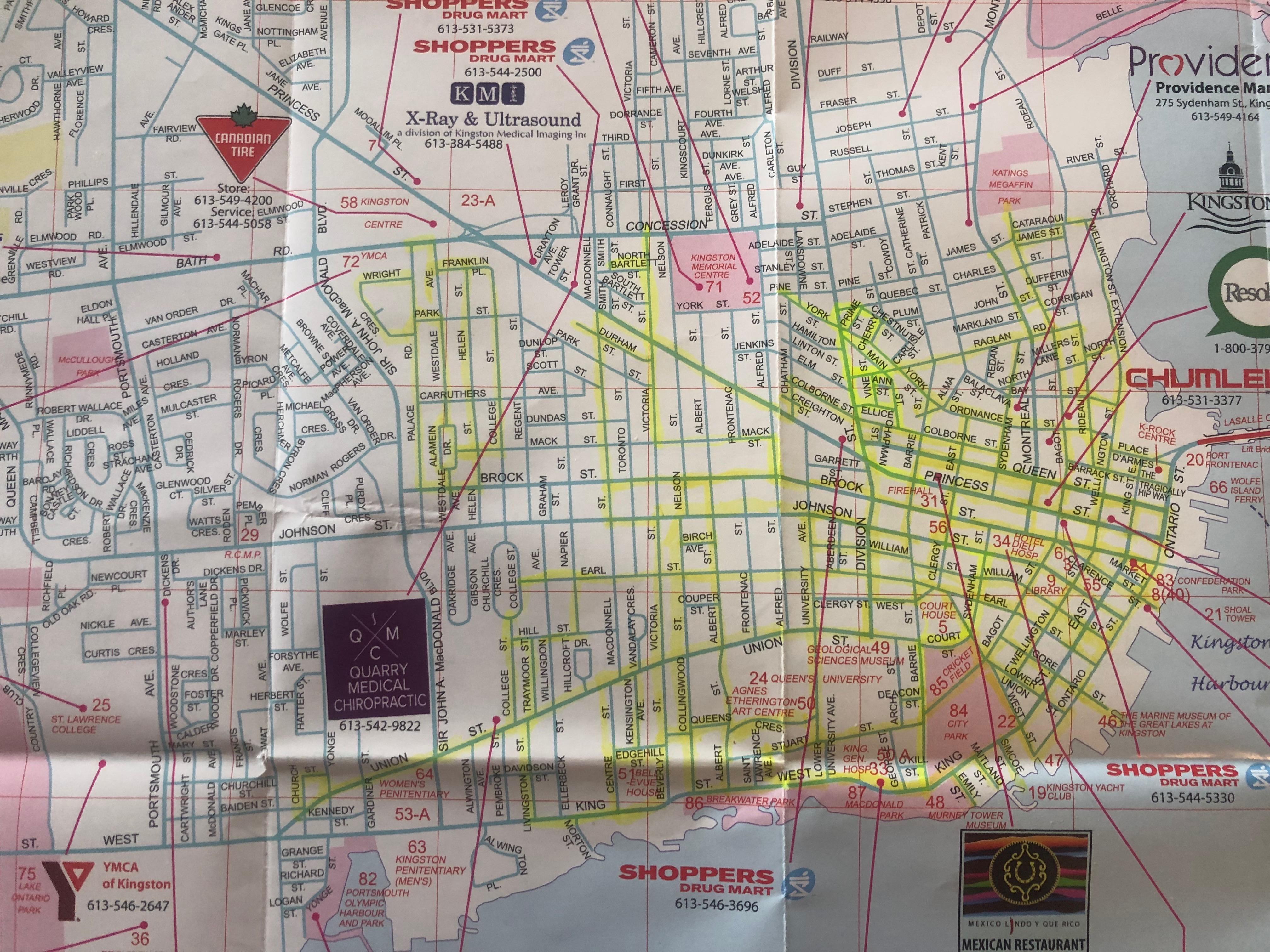 I’ve walked all the streets marked in yellow on this map of Kingston’s core.