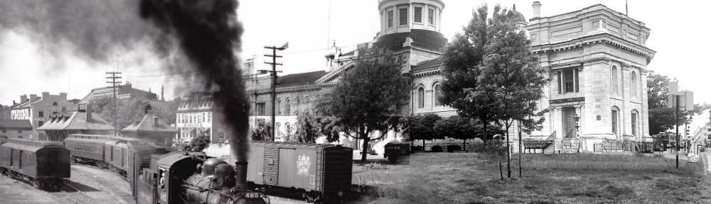 In the photo above, I have blended two pictures taken at what is now Confederation Basin. I took the one on the right this morning. The left half is from 1953 when there were still tracks running through what is now the park where the fountain is in front of City Hall. The train is leaving a bit of a carbon footprint, I think.