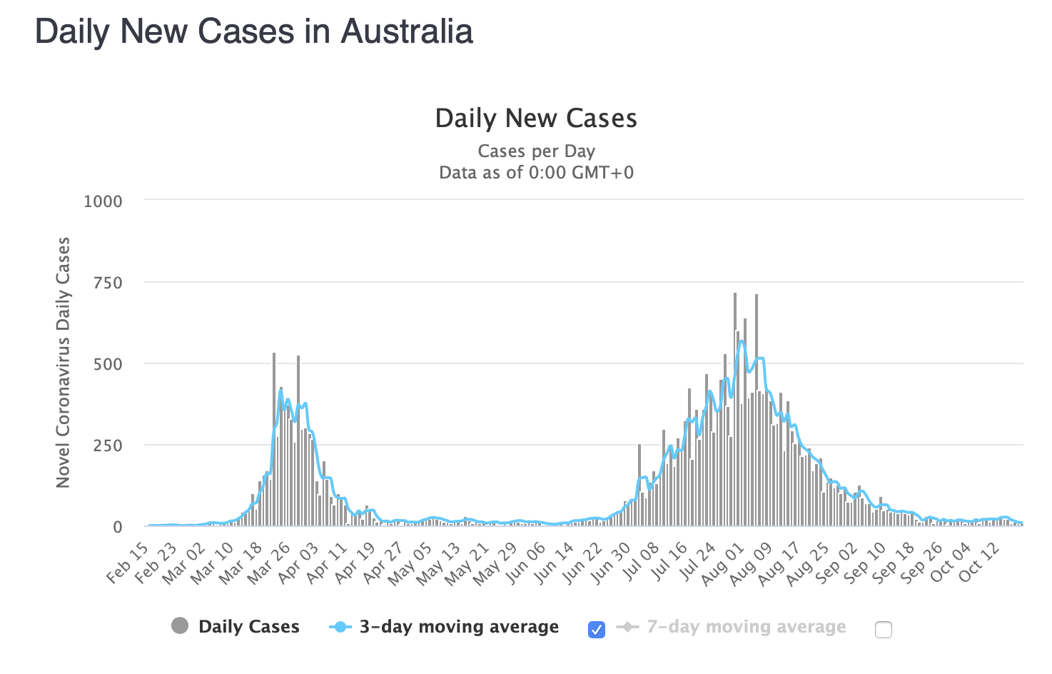 Australia, after seeing very low numbers for months, had a dramatic surge in Melbourne in late July resulting in daily new cases of over 700. They took determined action to reduce spread, including shutting down that district. Today their new case rate for the country was 8.