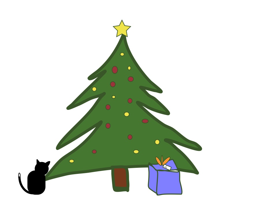 Dad, in the meantime, is trying to figure out how to tie the tree to the curtain rod to keep it from falling over. Mom is busy cleaning up needles and sap and broken glass and asking why Dad got that tree in the first place. Tippy the cat is curiously watching and is soon choking on a tinsel ribbon until she throws up.