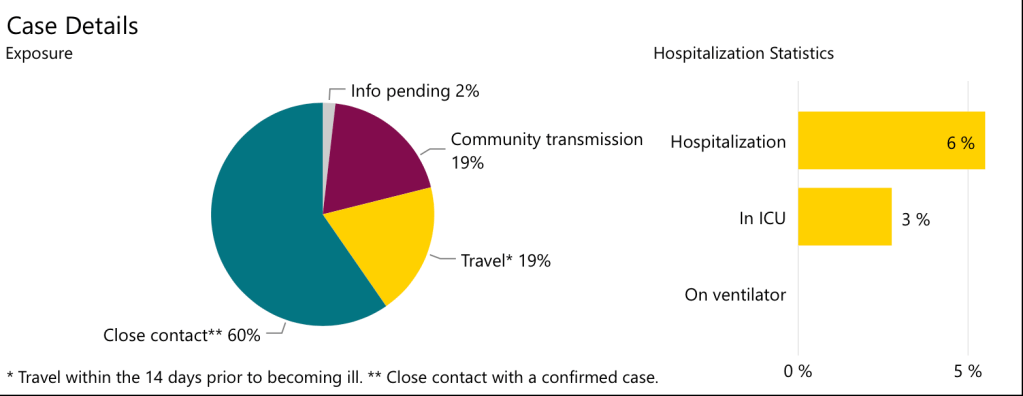 In addition the KFLA Health Unit figures indicate that only 18% of the cases in our district were “Community Acquired”, the rest being found in returning travellers or direct contacts of known cases. Our Health Unit serves about 215,000 people. That means that of the 61 diagnosed cases – I say “diagnosed” because we don’t know if there are others out there that we have missed because they were not tested – 11 of them arose from sources unknown or random community transmission. That is one such case in 20,000 people. Those are not bad odds.