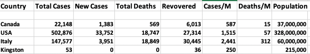 In Kingston, Ontario, where I live, we have been fortunate to have been able to keep the “curve” pretty flat. Our community of about 215,000 people has only had 53 documented cases of COVID-19 with 36 of those people having recovered. As of April 10 we have not had any COVID-related deaths and only two people are currently in hospital being treated for COVID-19 specifically. Some of this is just good luck. But the community has certainly embraced the principles of social distancing responsibly. Other factors that may have helped are that the local university and college has closed up and many students have gone home. We have no tourists. Clinics are treating their patients “virtually” rather than in face-to-face visits. We have passed the 14 day risk period from returning spring break or winter snowbird travellers who have isolated themselves to protect the rest of us. Congratulations Kingston, it’s working for you right now.